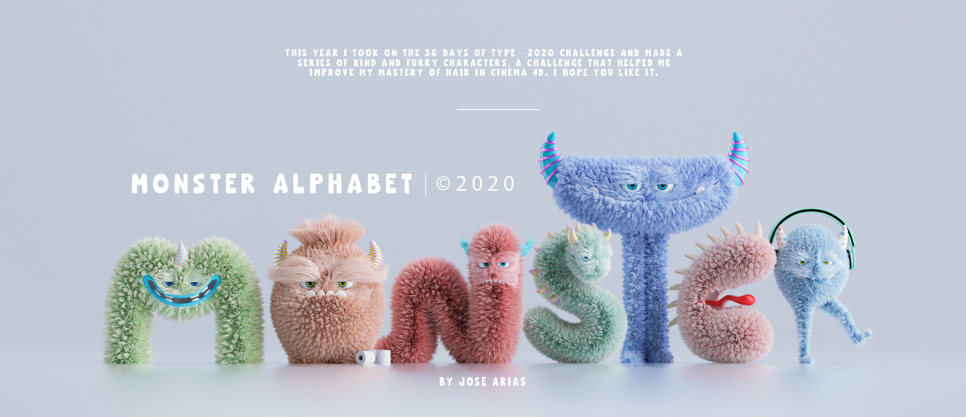 This year I took on the 36 days of type - 2020 challenge and made a series of kind and furry characters, a challenge that helped me improve my mastery of hair in Cinema 4D. I hope you like it.